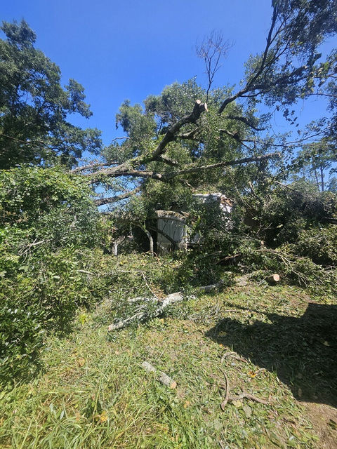 The tree below happened to of fallen on our house and destroyed the house and everything in it. We did not have wind insurance and FEMA gave us $48. For gas.